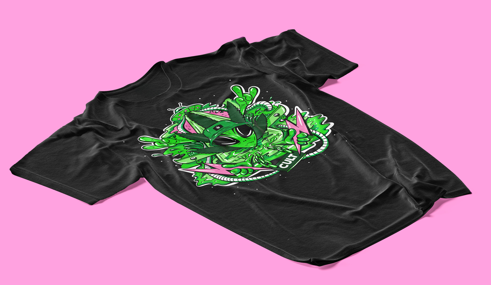 Out of this world packaging for Cult's edgy limited edition hamp energy drink. The flavour hit the shelves in 2020 as part of a summer marketing campaign, with in-store material, outdoor posters and merchandise. The design features custom alien illustrations applied throughout the entire universe.